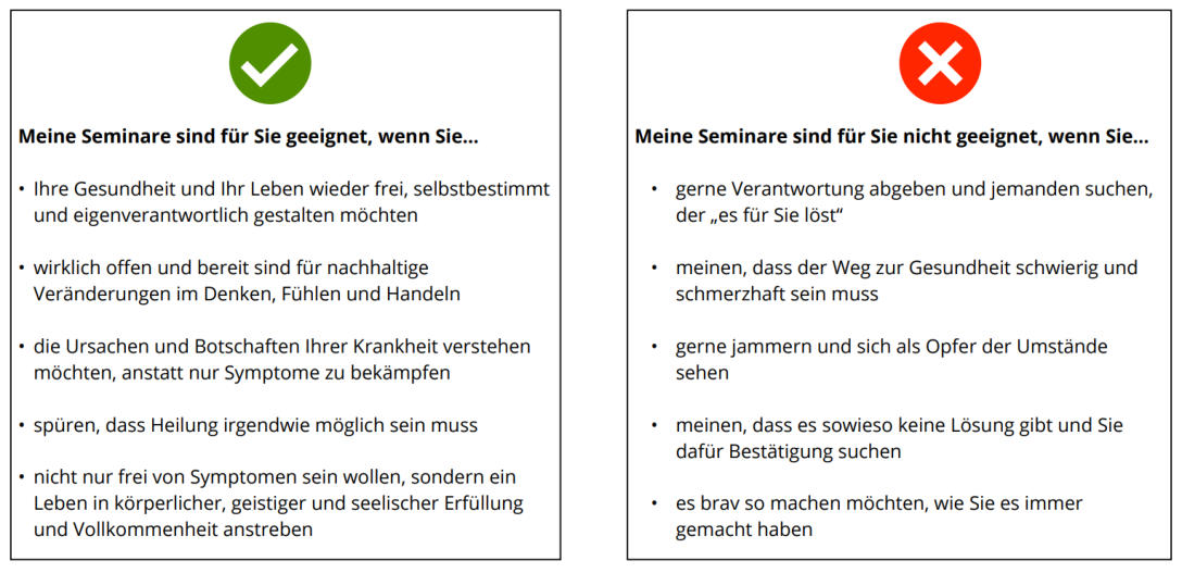 EinIntensiv-Seminar für Menschen, die gerade in einer (gesundheitlichen) Krise stecken und Lösungen suchen.Das Seminar wendet sich primär an Macher* ohne medizinische oder psychologische Ausbildung. Natürlich sind auch Ärzte, Heilpraktiker, Therapeuten und Coaches willkommen, die das Wissen aus dem Seminar für sich und ihre eigenen Klienten bzw. Patienten umsetzen möchten.